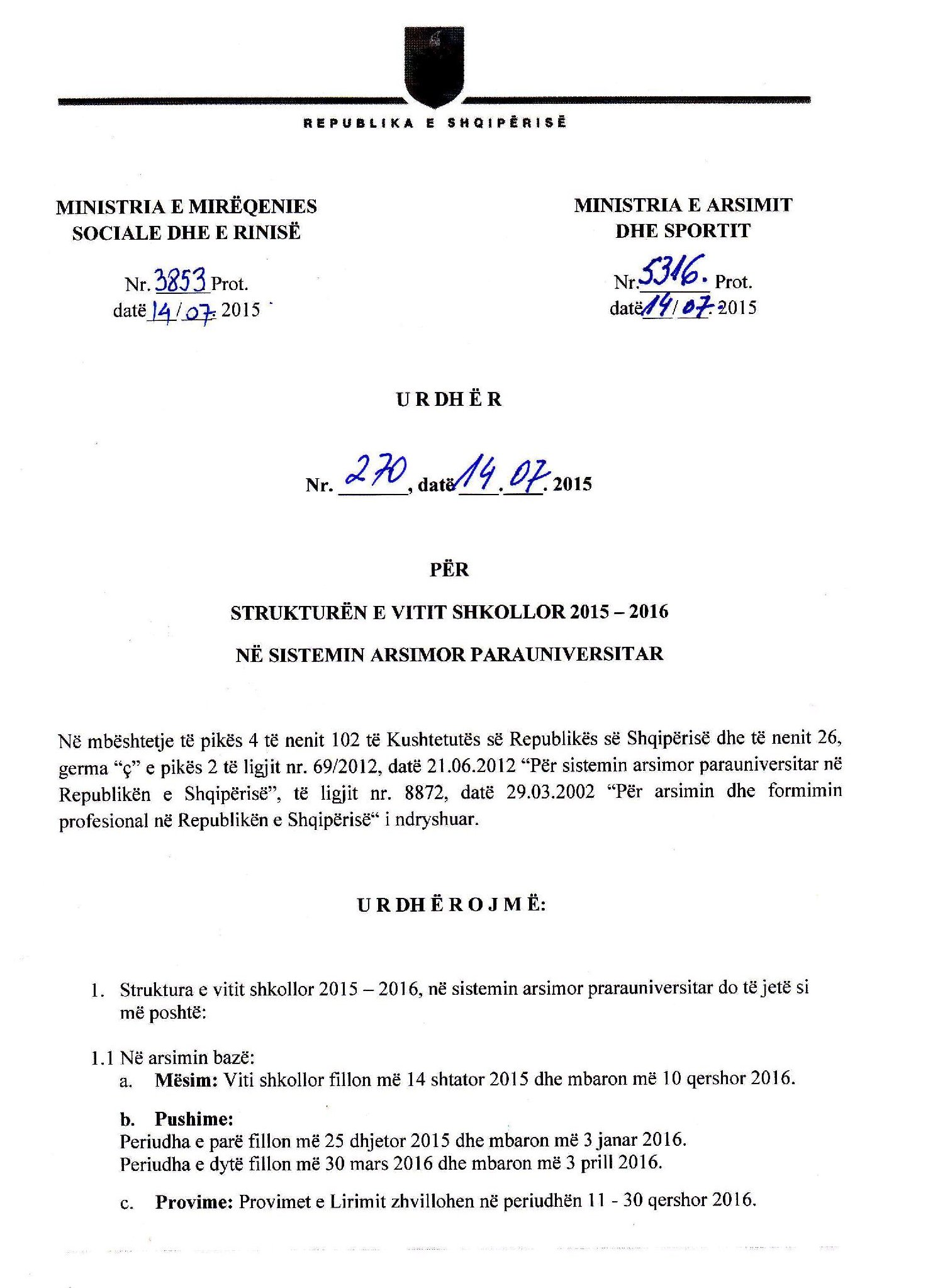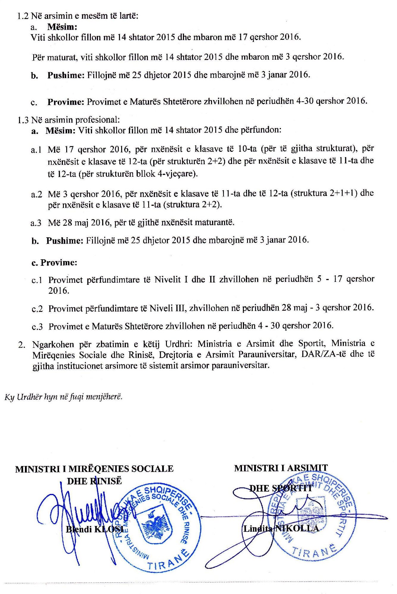 Udhezimi i Vitit te Ri Shkollor 2015-2016 per Arsimin ParaUniversitar - Zyra Arsimore MIRDITE